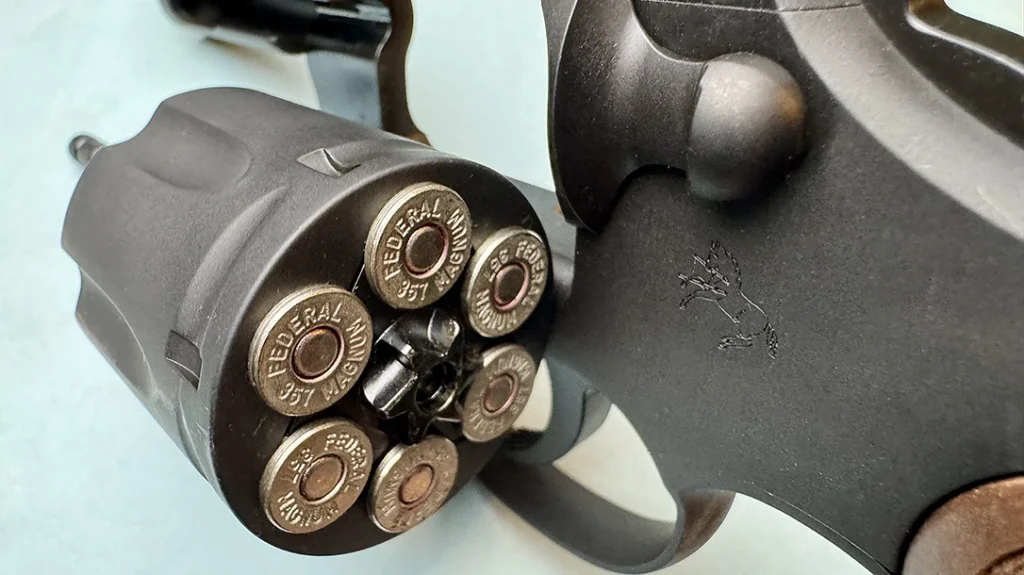 Number one, the fun diminishes somewhat when firing 101 Magnums in a 39-oz revolver with wood grips and an exposed backstrap. For extended practice, I’d go with .38 Special cartridges. There were no malfunctions or issues during the test shoot. The ejector rod consistently kicked the empty cases out with ease, and there was no case sticking or pressure signs. The red ramp front sight was easy to pick up in rapid-fire shooting, and did well with the more deliberate bullseye shooting. The factory grips didn’t interfere with speedloader use, which is a plus for less bulky grips.