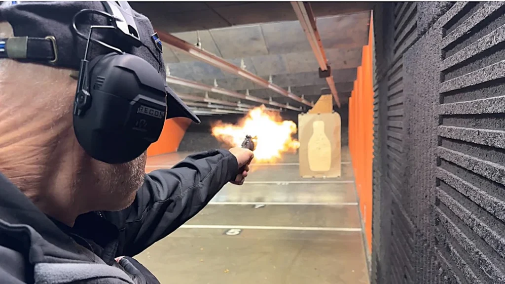 To do some double action shooting, drawing from concealment, and using the speedloader for fast reloads, I devised a simple course. I loaded up the Python and the HKS speedloader with different .357 Magnum cartridges and sent an FBI Q silhouette target to the 5-yard line. I was wearing my winter jacket so when I went to draw from the Kirkpatrick holster, I used my right hand to sweep back the unzipped jacket at the same time my support hand was coming up.