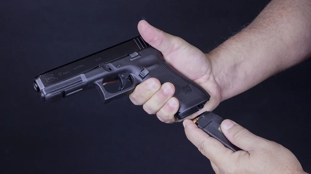 Now, have the gun in front of your chest at a comfortable distance (your “workspace”), and tilt the mag well towards the hand that has the magazine. Move your magazine towards the mag well of the pistol and guide it in with your index finger. Once it’s going into the mag well, move your index and firmly push the magazine into the pistol. You will feel and hear a click once the magazine is seated. Next up is to rack the slide and chamber the first round. Hold the grip with your dominant hand and cup the slide near the rear firmly. At the same time, push the grip forward and pull the slide back. Once the slide comes all the way back, release the slide and your pistol is now ready to fire.