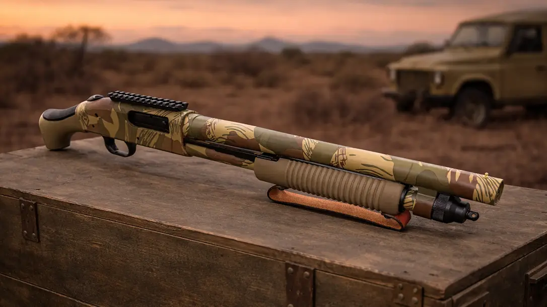 One of the most striking attributes of the 590 Bliksem is its premium finish. The firearm’s metal surfaces are coated in Rhodesian Brushstroke camouflage for enhanced concealment, while the receiver is engraved with the MOD Wolf Logo, used with permission from Field Ethos Journal and MOD. A Flat Dark Earth AfterShock bird’s head-style pistol grip – shaped to reduce felt recoil and improve control – pairs with a Flat Dark Earth corncob forend featuring a real leather strap with the Mossberg debossed logo. A Picatinny rail sits on top of the receiver for the mounting of optics. Each firearm also includes a 6-shot shotshell carrier card attachment for added on-gun ammunition capacity.